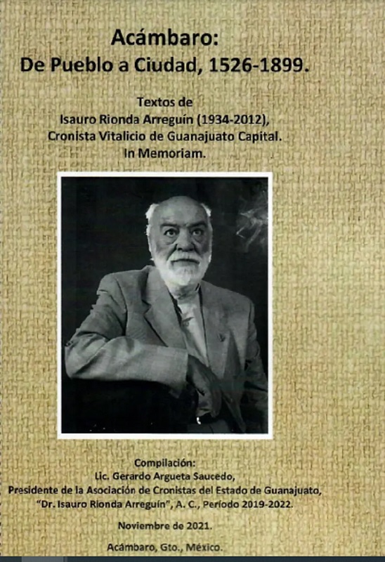 El sábado 17 pasado participé en la presentación de un libro póstumo de mi padre, el maestro Isauro Rionda Arreguín. El libro se denomina Acámbaro: De pueblo a ciudad, 1526-1899. El texto fue publicado por la Asociación de Cronistas del Estado de Guanajuato, cuyo presidente, el maestro Gerardo Argueta Saucedo, cronista del municipio de Acámbaro, se encargó de la selección de los cinco artículos de fondo que lo integran, y que se habían publicado antes en diversos momentos y medios. La presentación se realizó en el salón de actos de la parroquia de San Francisco en Acámbaro. El rector del Santuario Mariano, Fray Javier Gordillo Arellano OFM, fue el cariñoso anfitrión de este evento, enmarcado en los festejos de los 496 años de la fundación de esa antigua ciudad de los magueyes.