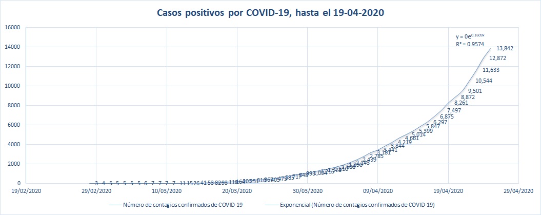 De acuerdo con la información disponible, aunque estamos ya en la Fase 3, en la cual se da la diseminación intensa de casos, la curva aún no adopta la tendencia exponencial en el número de defunciones; y lo deseable, evidentemente, es que así se mantenga y que se logre la ya famosa meta de “aplanar la curva” y poder extender la epidemia, pero sin colapsar ni saturar a los servicios de salud en su capacidad de atención a las personas que requieran de hospitalización y asistencia respiratoria. En el siguiente gráfico se observan los casos confirmados de definciones por COVID, y la línea más tenue muestra la tendencia exponencial que puede darse en el momento en que inice la fase crítica.