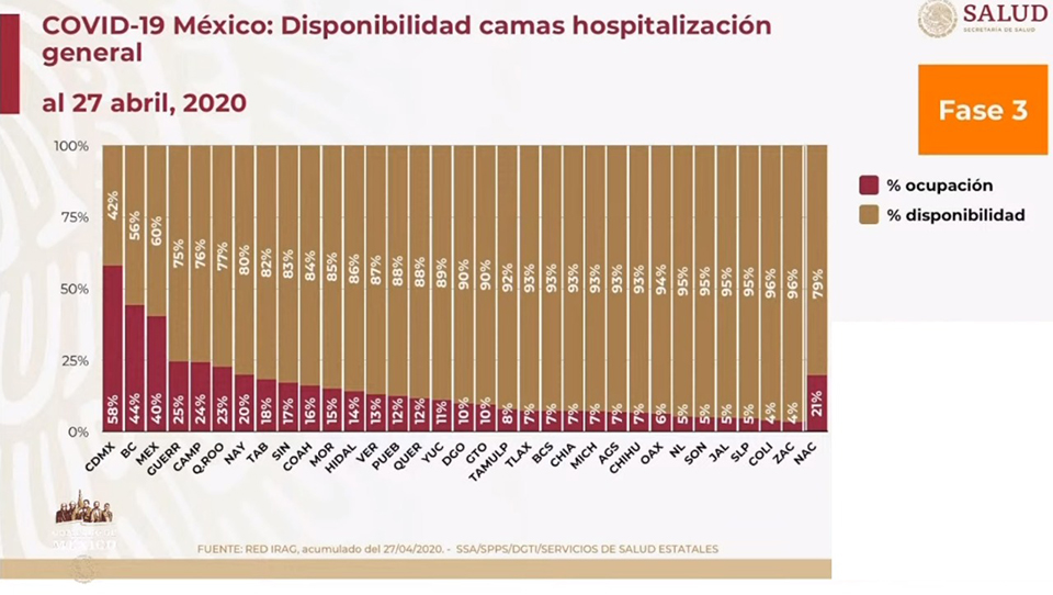 Se informó también sobre la ocupación de camas en hospitales, la cual en Ciudad de México llegó a 58%, en Baja California ya se ocupó el 44% de las camas y en Estado de México el 40%. El promedio nacional de ocupación de camas de hospital es de 21%.