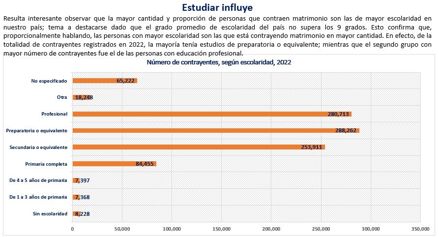 Los datos del INEGI permiten constatar la importancia de las reformas legales que se han llevado a cabo en nuestro país, respecto de la prohibición del matrimonio infantil. En efecto, en el 2013 se registraron 48,275 casos en los que al menos una de las personas contrayentes era menor de edad. Para el 2015 la cifra descendió a 35,178; en el 2015 cayó a 24,338; en el 2016 a 11.548; en el 2017 se tuvo una muy importante caía a 2,725 casos; en el 218 fue de 589; y a partir de 2019 se logró que la cifra bajara de los 100 casos cada año, llegando a únicamente 32 en el año 2022.