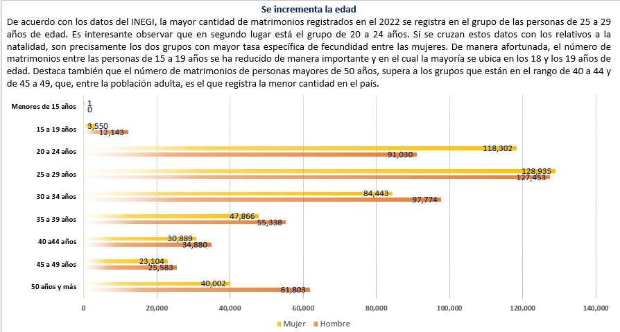 Los datos del Instituto Nacional de Estadística y Geografía (INEGI) muestran que hay una tendencia de cambio acelerado en la edad promedio para contraer matrimonio en el país. En efecto, en la última década el cambio ha sido notable: mientras que en el 2013 la edad promedio para casarse entre los hombres fue de 29.8 años, para el año 2018 había crecido a 32.3 años, mientras que en el 2022 se llegó a la edad promedio más alta, con 34.1 años. Es de destacarse que, en el periodo señalado, el aumento fue sostenido año con año.