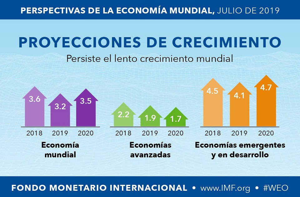 En el Informe de Perspectivas de la Economía Mundial de julio de 2019, se estimó que para este año, la economía mexicana crecerá al 0.9%: cifra que representa un ajuste de 0.7 puntos porcentuales menos, comparado con lo que se pronosticaba en la edición de abril del mismo reporte.