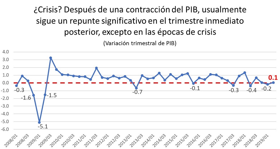 El crecimiento que registró el PIB durante el segundo trimestre de 2019 no fue negativo, por lo que técnicamente, no se trata de una recesión, la cual se define, tradicionalmente, por la contracción del producto durante dos periodos consecutivos.
