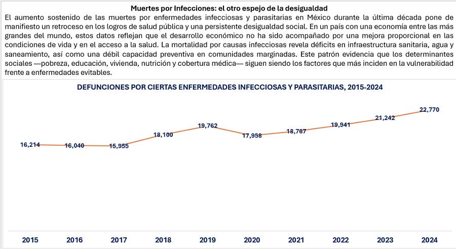 De esa suma, el INEGI estima que 186,749 defunciones tuvieron como causa principal la categoría de “ciertas enfermedades infecciosas y parasitarias”, lo que hace un promedio anual de 18,675 para el periodo de 2015 al 2024. En efecto, en 2015 sumaron 16,214 casos, teniendo la cifra más baja en el año 2017, con 15,955 casos. Sin embargo, en los años 2022, 2023 y 2024 se han tenido incrementos relevantes al llegar, a 19,941; 21,242 y 22,770 decesos en esos años, respectivamente. De este modo, si se compara al 2024 con 2017, que son los años con los datos más alto y más bajo, respectivamente, el incremento es de 30%.