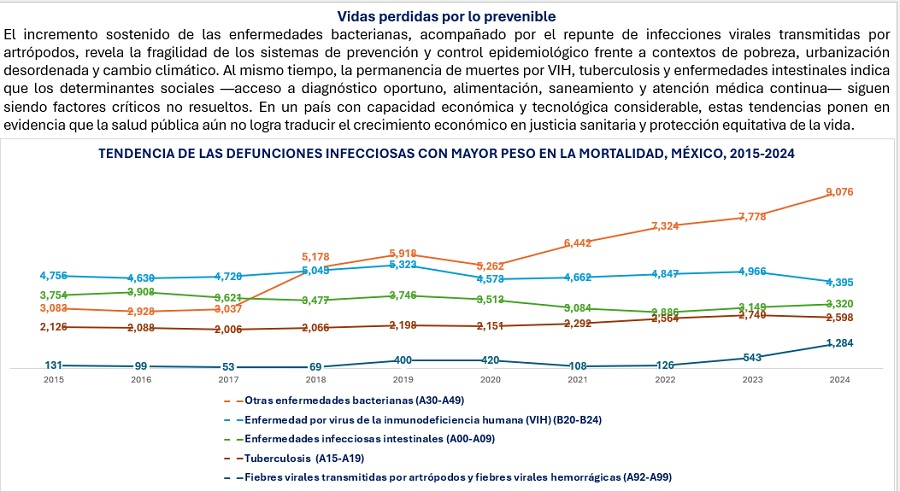 Las defunciones por tuberculosis también presentan un repunte al haber pasado de 2,126 casos en el 2015 a 2,598 en el 2025. Finalmente está el caso de las fiebres virales transmitidas por artrópodos y fiebres virales hemorrágicas (como el Dengue); en este rubro el incremento es muy relevante al haber pasado de 131 caso en 2015 a solo 53 casos en 2017; pero a partir de ese año ha habido un incremento sostenido hasta llegar a 1,284 defunciones en 2024.