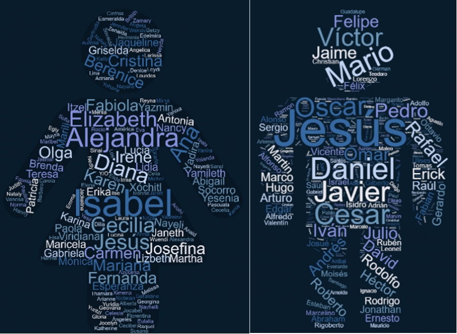 La imagen muestra los nombres de las personas desaparecidas desde 1968 que se encuentran registrados en fuero federal. El tamaño de cada nombre está relacionado con la frecuencia con la que aparece en la base de datos.