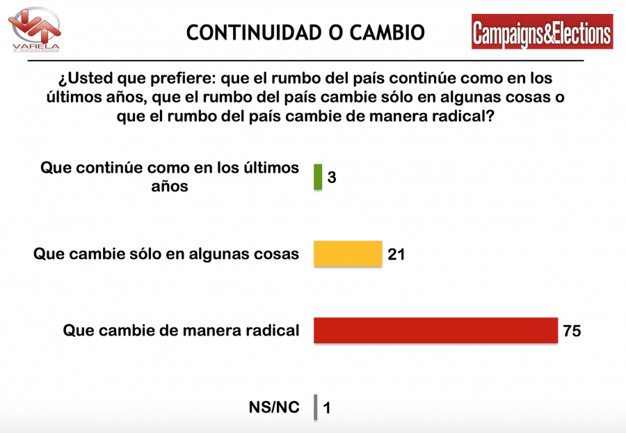 Además, 75% de los encuestados afirmaron que quieren que el rumbo del país “cambie de manera radical”, 21%, “que cambie solo en algunas cosas” y 3%, que “continúe como en los últimos años”.