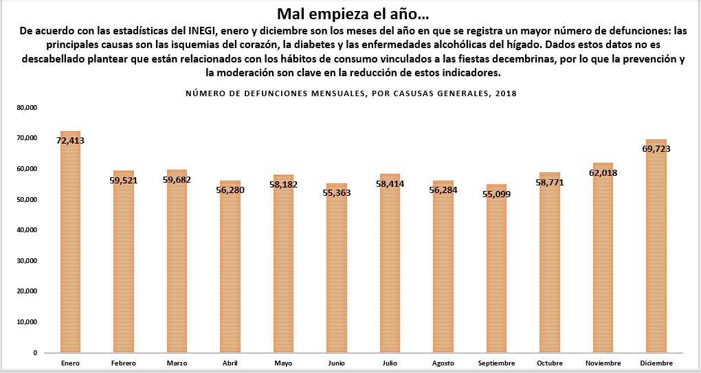 De acuerdo con el Instituto, enero es el mes del año en que se concentró mayor número de defunciones, con 72,413 casos, las cuales representan el 10% del total de las ocurridas a lo largo del año. En segundo lugar, se encuentra el mes de diciembre, con 69,763 casos, los cuales representan el 9.6% del total; seguido del mes de noviembre, con 8.6% de las defunciones ocurridas en el país.