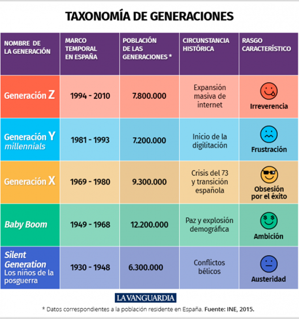 En la era de la postmodernidad, de avances científicos y tecnológicos nunca imaginados en tan corto tiempo y, por otro lado, la acelerada infodemia, generan una brecha en el aprovechamiento de estos conocimientos, llevando a una sociedad más confundida y sin tiempo para la reflexión y, es aquí donde confluyen las diferentes generaciones con sus propias culturas, donde el sistema económico1 las adjetiva de acuerdo con los comportamientos y, ahora con más precisión y eficacia, dada la huella digital que se deja en la web. En la taxonomía de las generaciones, como se muestra en la siguiente imagen (2), podemos observar rasgos distintivos para cada generación y por ende la forma como afrontan y construya misiones de vida dependerán de ello. Pero, son rasgos y no determinan o son destino, pero suman a entender la influencia de los cambios sociales, políticos y sobre todo económicos tienen.
