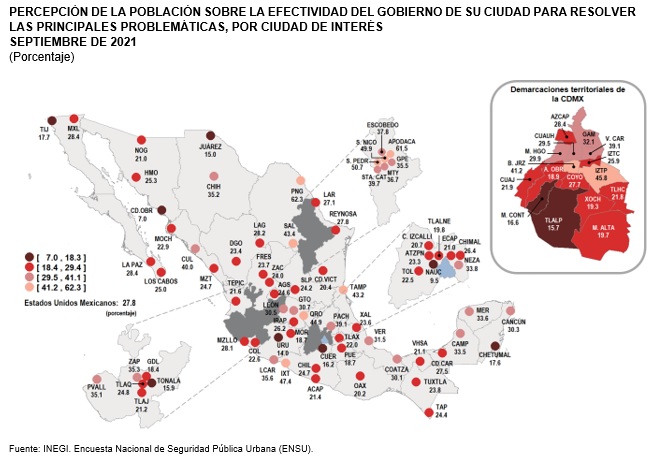 El Instituto Nacional de Estadística y Geografía (INEGI) dio a conocer los resultados de la más reciente edición de la Encuesta Nacional de Seguridad Pública Urbana (ENSU), con fecha de levantamiento en el mes de septiembre d 2021. Uno de los tabulados que integran a esta encuesta, es el relativo a los gobiernos menos efectivos para resolver los problemas de mayor preocupación ciudadana en las ciudades en que habtian