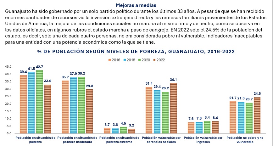 De acuerdo con los datos de la Medición Multidimensional de la Pobreza que hace cada dos años el Consejo Nacional de Evaluación de la Política de Desarrollo Social (CONEVAL), en Guanajuato hay una muy modesta reducción de esos indicadores entre el 2016 y el 2022. En efecto, en el primer año señalado, el 39.4% de la población estatal fue considerado en esa situación; para el 2018 el porcentaje se incrementó a 41.5%; en el 2020 creció a 42.7%; mientras que en el 2022 se ubicó en 33%; es decir, entre 2016 y 2022 la disminución fue de 5.6 puntos porcentuales, lo que equivale a menos de un avance de un punto porcentual cada año. La gravedad de la cuestión se puede dimensionar si se considera que para el 2030 México debería haber erradicado la pobreza en todas sus formas. Sin embargo, al ritmo reportado, esto podría lograrse quizá alrededor del año 2052.