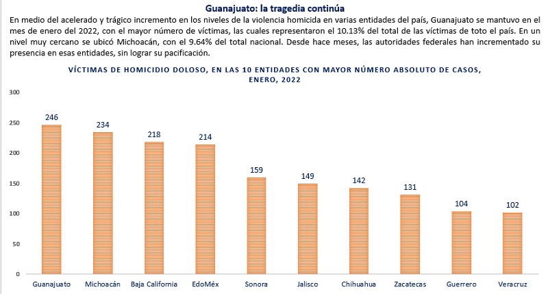 A pesar de lo notorio y preocupante del crecimiento de la violencia homicida en varios estados, el estado de Guanajuato aparece en enero nuevamente como la entidad con mayor número de víctimas de homicidio intencional, sumando 246 personas que perdieron la vida por lesiones intencionales.