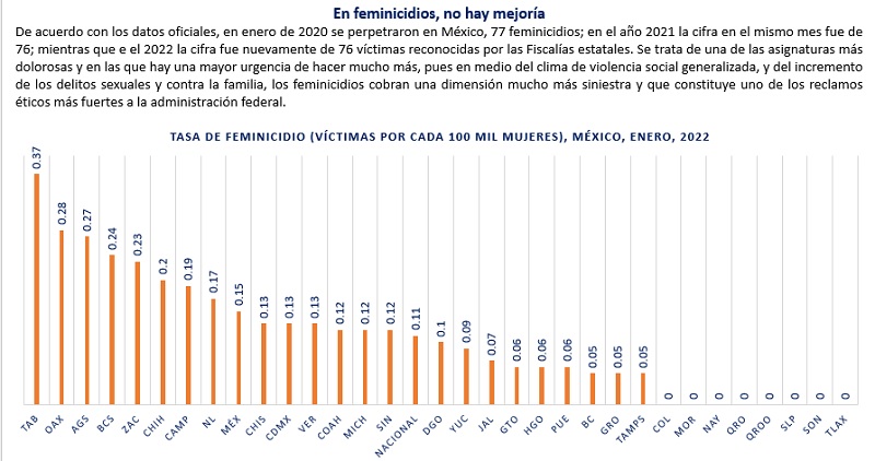 En el caso de los feminicidios, la tasa promedio registrada para el país es de 0.11 víctimas por cada 100 mil mujeres, indicador sólo para el mes de enero. A diferencia del caso de los homicidios, en el indicador relativo al feminicidio hay 15 entidades con datos mayores al promedio nacional.