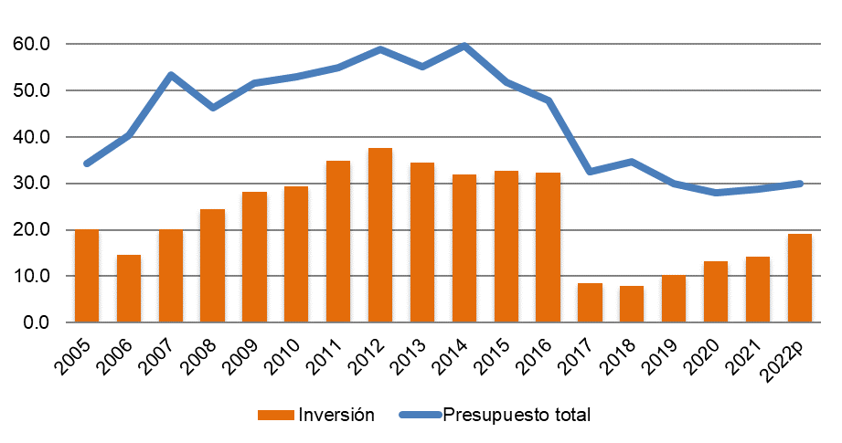 Presupuesto total y de inversión de la Comisión Nacional del Agua 2005-2022.