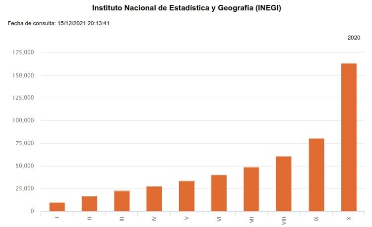 De esta forma, los datos del INEGI indican que en la parte “de arriba de los ingresos”, el decil VIII obtuvo el 12.2% de los ingresos al inicio del año, y 12% al final; el decil IX accedía al 16.1% y al cierre del año, el 16%; mientras que el decil X, es decir, el de más altos ingresos, pasó de 31.4% a 32.5% entre el inicio y el cierre del año. Es decir, no sólo fue el que no perdió, sino que su margen de acumulación creció casi exponencialmente frente a lo que ocurre en los estratos más bajos de ingresos.