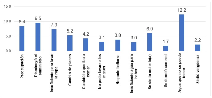 La figura 1 muestra que las experiencias, mencionadas por una mayor proporción de hogares, fueron: la existencia en el hogar de agua que no era potable o confiable para consumir (reportada por el 12.2% de los hogares entrevistados); la disminución o interrupción del suministro habitual de agua (9.5%) y la preocupación por no tener suficiente agua para cubrir las necesidades de los miembros del hogar. Estas experiencias ocurrieron más de diez veces en las cuatro semanas previas a la fecha de la entrevista.