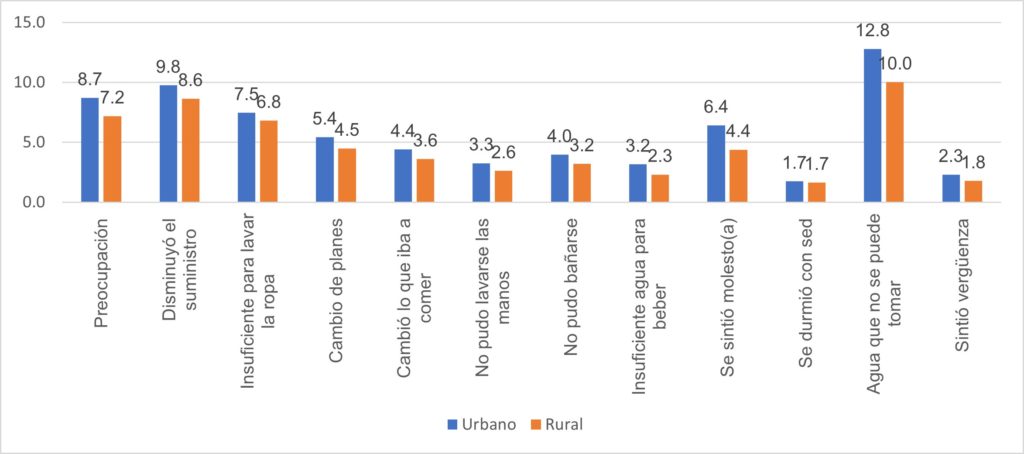 Se observa también que los hogares que habitan en localidades urbanas (con 2500 o más habitantes) reportaron una proporción ligeramente mayor, de experiencias atribuidas a problemas con el agua, en comparación con las localidades rurales (población menor a 2500 habitantes).