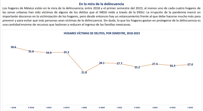 La Encuesta Nacional de Seguridad Pública Urbana (ENSU), del Instituto Nacional de Estadística y Geografía (INEGI), presentó el nivel de victimización de los hogares mexicanos, medida por semestre, para el periodo 2018-2023. La medición incluye los delitos de robo total de vehículo, robo de accesorios, refacciones o herramientas de vehículos; robo o asalto en calle o transporte público, robo en cajero automático o robo en banco; robo en casa habitación, otros tipos de robo y extorsión.