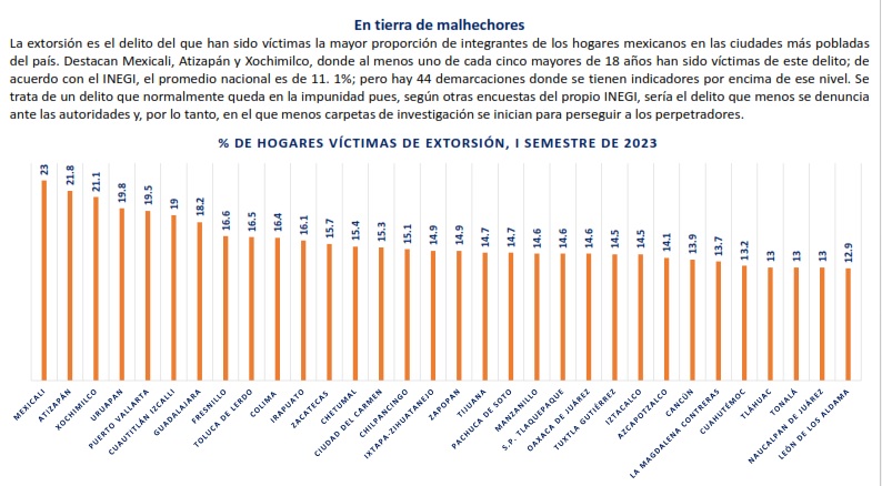 De acuerdo con el INEGI, del total de los 18.5 millones de hogares que comprende la ENSU, en el 1er semestre de 2023, el 11.1% de los hogares o alguno de sus integrantes fueron víctimas de Extorsión; 9.2% lo fueron de robo parcial de vehículo; 8.8% de sobo o salto en calle o transporte público; 4.5% de robo en casa habitación; 2.8% lo fueron de robo total de vehículo y 1.8% de robo en forma distinta a las anteriores.