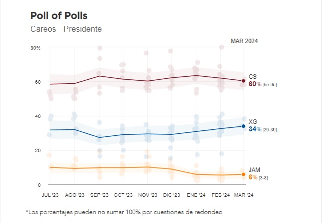 Ahora bien, uno de los temas relevantes al dar seguimiento a las encuestas es encontrar o determinar tendencias. En ese sentido, vale la pena desagregar los datos para los tres meses que ya casi han transcurrido en este año. Así, en enero, el promedio de preferencias para Sheinbaum fue de 63.9%; para Gálvez fue de 30.7% y para MC un 5.2%