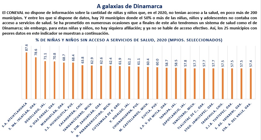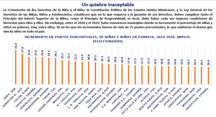 De acuerdo con los datos del CONEVAL, en todo México, en el 2020, había 422 municipios donde 90% o más de las niñas, niños y adolescentes que viven en ellos se encuentran en condiciones de pobreza multidimensional. Entre ellos, hay 15 municipios donde el 99% de las niñas niños y adolescentes son pobres: en San Franscisco Teopan, Oaxaca, el 100% de esta población es pobre; en San Simón Zahuatlán, Oax. Y en Cochoapa el Grande, Gro., el porcentaje es de 99.8%; En Chanal y San Juan Cancuc, Chis. Lo son el 99.6%; en Coicoyán de las flores y en San Miguel Tilquiápam, Oax y en Aldama, Chis., lo son el 99.5%; En Chalchihuitlán, Chis. Y en San Lucas Camotlán el porcentaje es de 99.4%; en Santa Ana Atleixtlahuaca y en Santiago Amoltepec, Oax. Y en Chenalhó, Chis. El porcentaje es de 99.2%; en Rincón Chamula, Chis., 99.1% y en Santiago Tlazoyaltepec, Oax., 99%.
