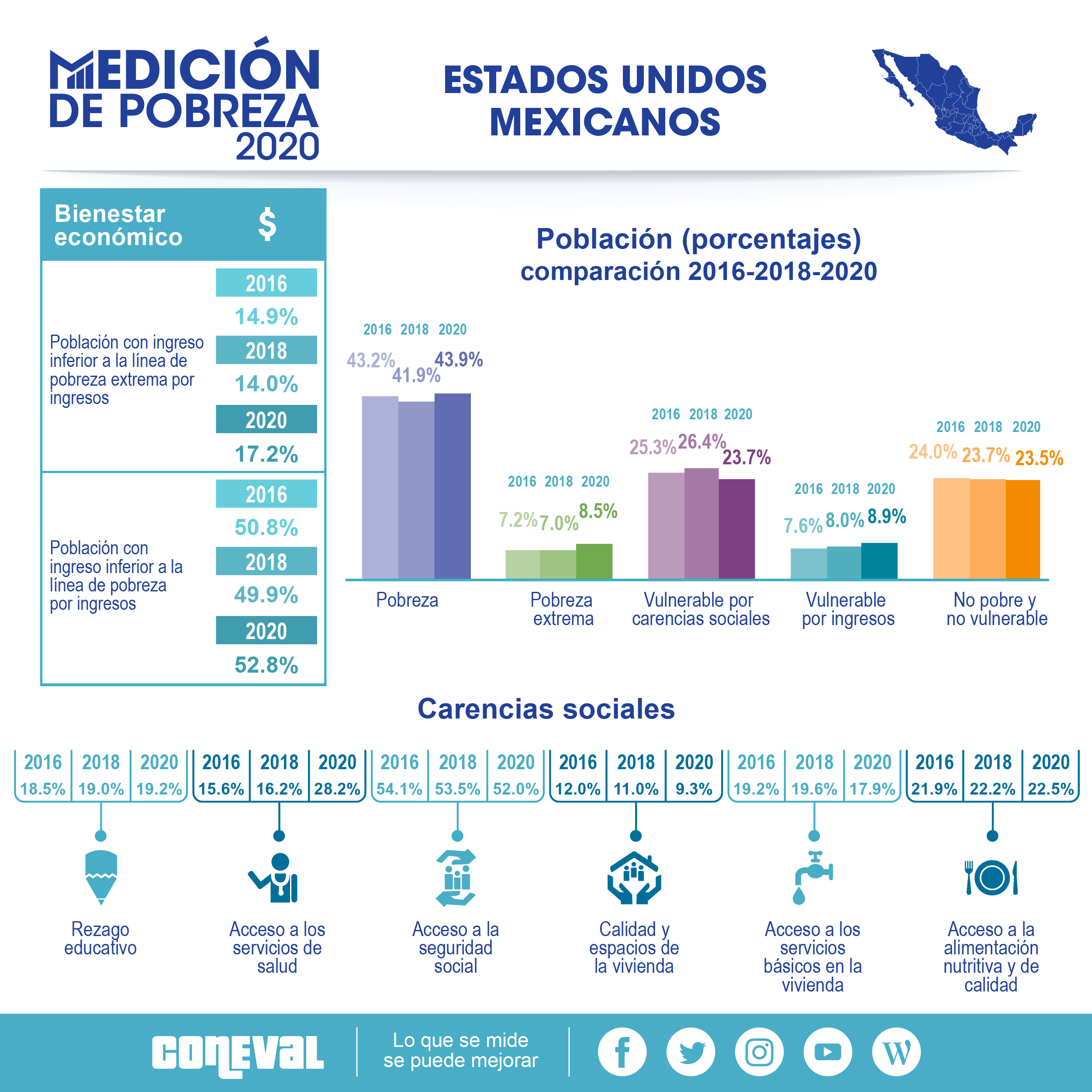 Cifras proporcionadas por el mismo CONEVAL señalan que la disminución sistemática del porcentaje de personas en condición de pobreza extrema en el año 2010 alcanzaba al 11.3 por ciento de la población, disminuyó a 7.4 por ciento en 2018, y entre este último año y el 2020 se elevó a 9.2 por ciento. El crecimiento en estos dos años fue 2.4 millones de personas en situación de pobreza multidimensional extrema. Se encuentran en esa situación porque tuvieron ingresos tan magros que no les permitieron satisfacer sus necesidades de alimentación y, además de ello, sufrieron tres o más carencias en los seis derechos considerados en la medición.