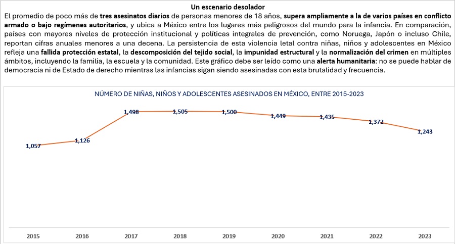 Finalmente es necesario subrayar la urgencia de proteger a la niñez, pues según datos del INEGI, entre 2015 y 2023 fueron asesinados 12,185 menores de 18 años, es decir, un promedio anual de 1,218, o bien, 3.3 casos por día.