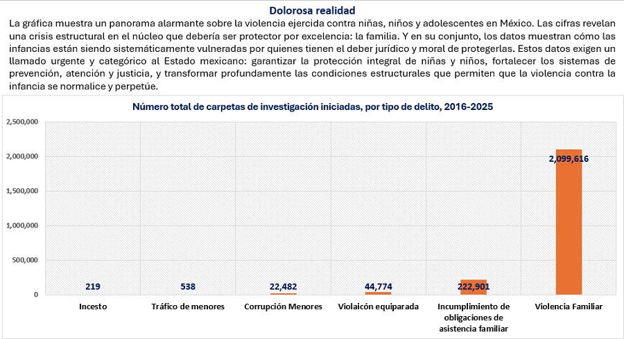 La principal fuente sobre la violencia criminal que se ejerce en contra de la niñez en México es el Secretariado Ejecutivo del Sistema Nacional de Seguridad Pública. En sus bases de datos, para el periodo 2016-2025, se tiene registro de que se han iniciado al 2.39 millones de carpetas de investigación por probables delitos en los que alguna o varias de las víctimas fueron niñas, niños o adolescentes. Este dato implica un promedio anual de 239 mil carpetas, o bien, 654 carpetas que se inician todos los días. Debe recordarse al respecto que la cifra negra en México supera el 90%, por lo que debe asumirse que hay un muy importante subregistro.