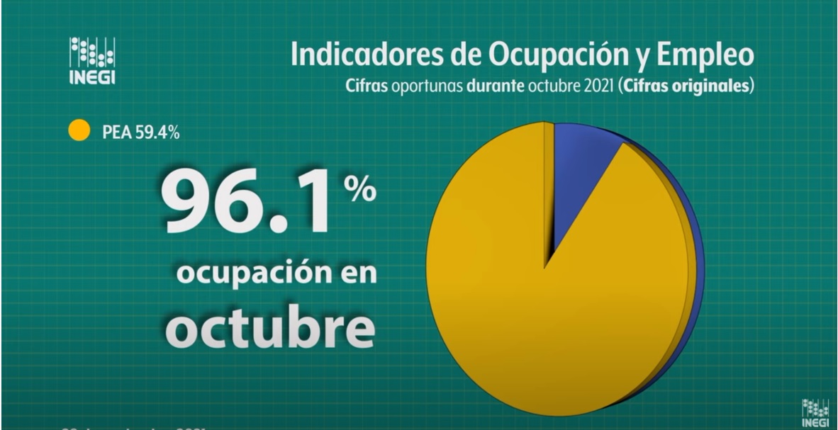 El Instituto Nacional de Estadística y Geografía (INEGI), presentó recientemente los datos relativos a los niveles de desocupación y desempleo en nuestro país, con fecha de corte al mes de octubre de 2021. El 96.1% de la Población Económicamente Activa se encuentra ocupada, y el 3.9% se encuentra desocupada. Así los niveles de desocupación: