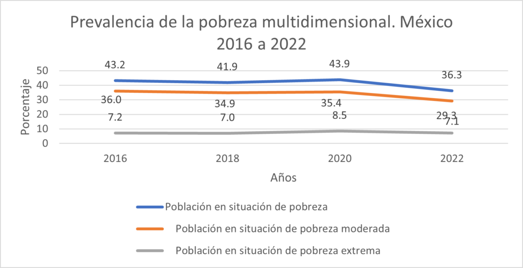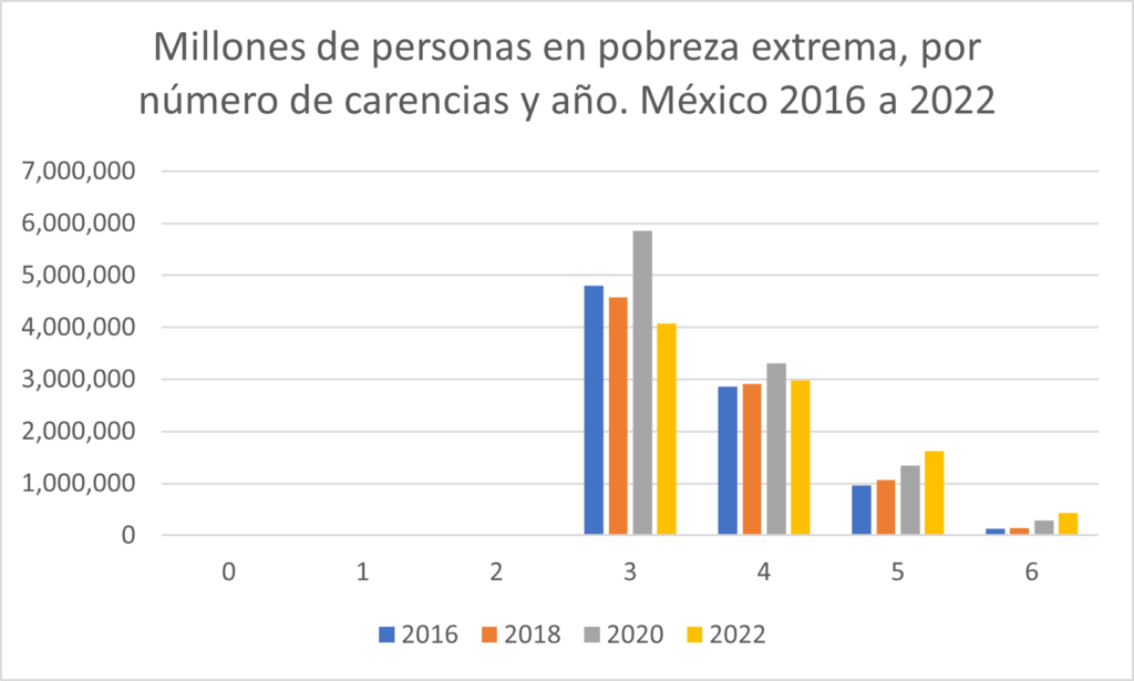 Según la medición multidimensional de la pobreza, la prevalencia de la pobreza extrema fue de 7.0 por ciento en 2018 y 7.1 por ciento en 2022, prácticamente permaneció inalterada en términos relativos como consecuencia de los efectos contrapuestos de (i) el alza en los ingresos para escapar a la pobreza monetaria y (ii) del aumento de las carencias sociales de este grupo.