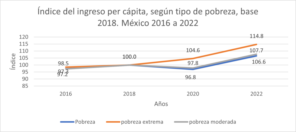 La información disponible muestra que la categoría de las personas en pobreza extrema tuvo la mayor alza en los ingresos (14.8%, ver gráfica 2) en los cuatro años que median de 2018 a 2022, pero, en general, no fue suficiente para alcanzar la línea de pobreza extrema, para lograrlo debería haber aumentado en, aproximadamente, un tercio más[1], en adición al 14.8%.