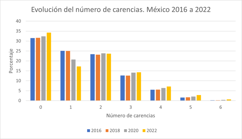 La insuficiente alza en los ingresos se combinó con el hecho de que, a partir de 2018, ha crecido la proporción de personas que no tienen satisfechos tres o más derechos sociales, como lo muestra la gráfica 6. En efecto, la distribución del número de carencias sociales de las personas en situación de pobreza extrema muestra que aumentó el promedio de carencias sociales (ver gráfica 6). En efecto, en el año 2018 el grupo de los pobres extremos tuvo 3.63 carencias sociales en promedio, cifra que se elevó a 3.82 en 2022.