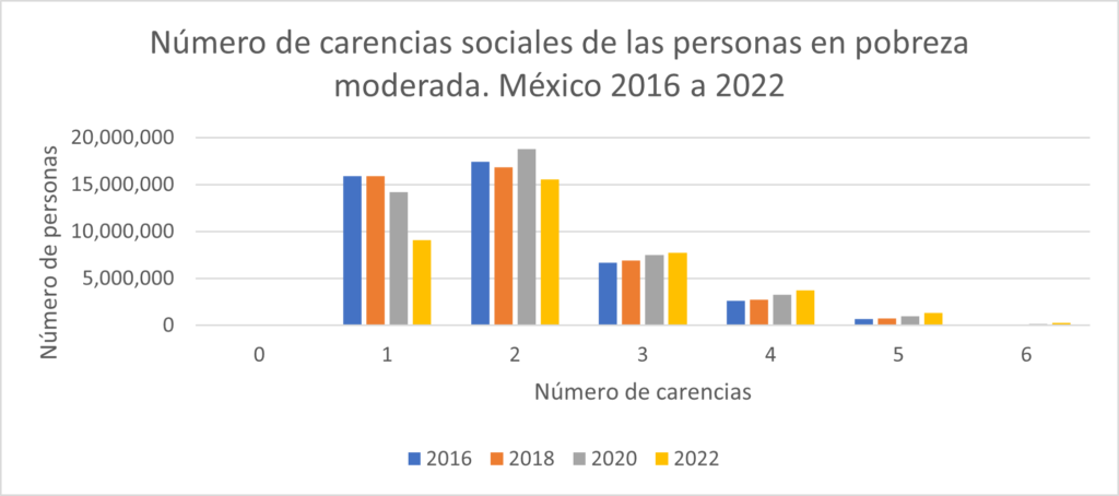 Ahora bien, la distribución del número de carencias sociales en la clase de los pobres moderados (ver gráfica 4) permite apreciar que, en 2022 respecto a 2018, disminuyó el contingente personas en pobreza moderada que tenían una y dos carencias (todas las demás aumentaron) de lo que se deriva que es muy posible que hayan transitado hacia la categoría “no pobres ni vulnerables” por la combinación del aumento en sus ingresos y la eliminación de sus carencias o bien al grupo de los vulnerables por carencias, en aquellos casos en que a pesar de incrementar sus ingresos permanecieron con alguna carencia.