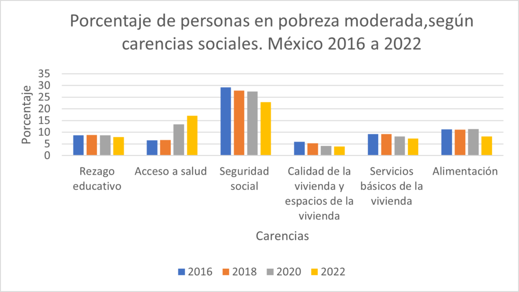 Además, este resultado deja claro que quienes abandonaron la condición de pobre estaban cerca de los umbrales que la definen: de acuerdo con su ingreso (ámbito del bienestar) y de los derechos sociales (en función de la combinación de carencias en salud, seguridad social, calidad y espacios de la vivienda, servicios de la vivienda, alimentación y rezago educativo). El transito observado a la no pobreza, desde la pobreza moderada, es un cambio corto, por ejemplo, una persona con un ingreso unos pocos pesos por debajo de la línea de pobreza monetaria en 2018 puede pasar a la categoría vulnerable por carencias en 2022 como consecuencia de los aumentos sostenidos en el salario mínimo real y si, a la vez, solventa las carencias que lo clasificaban como pobre moderado, pasará a engrosar la categoría no pobre y no carente.