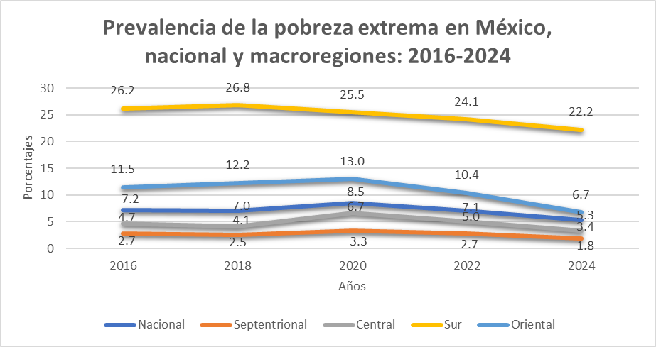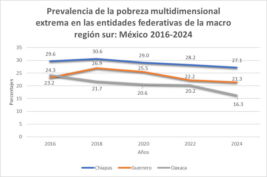 Sin embargo, llama la atención que la tendencia al aumento generalizado, en ese bienio, de ambos tipos de pobreza no se observó en la macro región sur, justamente en la que se ubican las tres entidades federativas que presentan los niveles más elevados según la medición oficial (Chiapas, Guerrero y Oaxaca). Esta peculiaridad fue el acicate para profundizar el estudio de la evolución de la pobreza en la macro región sur. Los resultados a los que se llegó se publicaron los meses de noviembre y diciembre de 2025 en este mismo medio. Ahora se continúa el análisis, pero esta vez se examina el comportamiento de la pobreza multidimensional extrema. Aquellos resultados, tomados en conjunto con los que se presentan en este artículo, ofrecen un panorama general de la evolución de la pobreza y pobreza extrema en la macro región en que se localizan los estados que presentan las más altas prevalencias de pobreza del país.