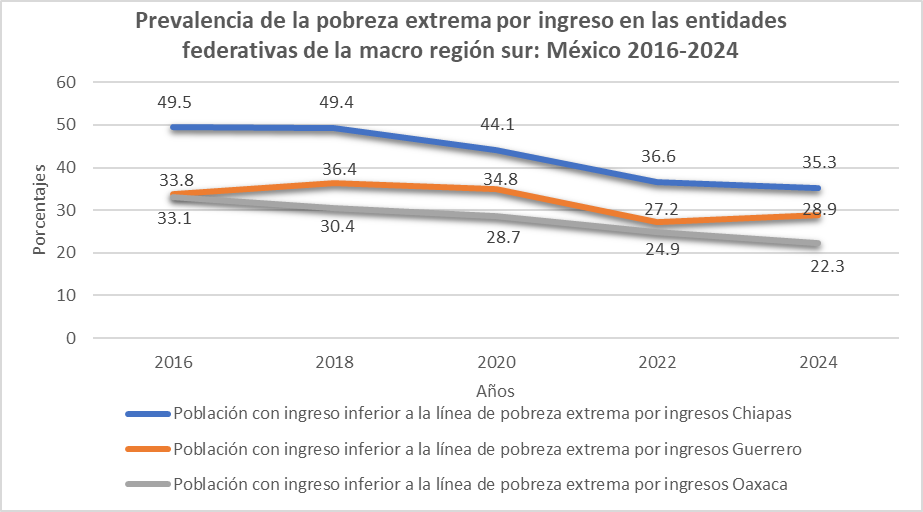 La pobreza extrema por ingreso en las tres entidades federativas de la macro región sur se redujo entre 2018 y 2020, sin embargo, fue más marcada en Oaxaca (casi 5 por ciento) que en Guerrero y Chiapas (alrededor del 2.5 y 2 por ciento, respectivamente); pero estos dos estados mostraron tasas de recuperación más elevadas en el bienio 2020-2022, del orden del 10 por ciento mientras que en Oaxaca fue solo de la mitad (5 por ciento). En el último bienio Chiapas y Oaxaca desaceleraron el descenso la tasa de reducción (fue de alrededor del 4 y 2 por ciento, respectivamente) mientras Guerrero, en un ambiente generalizado de abatimiento de la pobreza extrema en el país, experimentó una elevación del 6.2 por ciento.