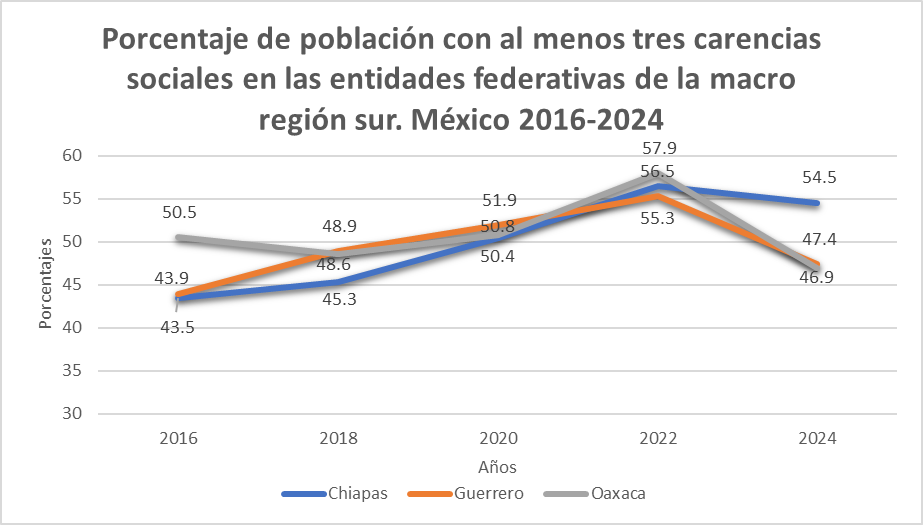 En fin, si bien la pobreza multidimensional extrema en la macro región sur experimentó una disminución sistemática desde 2018 a 2022, esta fue más acentuada en el estado de Guerrero. Entre los años 2022 y 2024, las mediciones estatales muestran comportamientos diferenciados en las tres entidades federativas. En Chiapas la tendencia en el último bienio confirma la tendencia iniciada en 2018, mientras que en Guerrero se desacelera y tiende a estabilizarse y en Oaxaca se acelera. A juzgar por el comportamiento de la pobreza por ingresos, los recursos económicos disponibles en los hogares de la macro región sur fueron más abundantes entre 2018 y 2022, que se extendió en el último bienio con mayor fuerza en Oaxaca que en Chiapas, pero Guerrero tuvo un claro traspiés, probablemente como consecuencia de los destrozos provocados por el huracán Otis. La reducción de la pobreza multidimensional extrema en Oaxaca no sólo fue resultado de la mejoría en los ingresos sino también de la pronunciada disminución de la prevalencia de tres o más privaciones sociales, fenómeno que también aconteció en Chiapas, pero con mayor discreción. En Guerrero la pobreza multidimensional extrema habría sido mucho más pronunciada si no hubiese sido por la disminución de las carencias sociales.