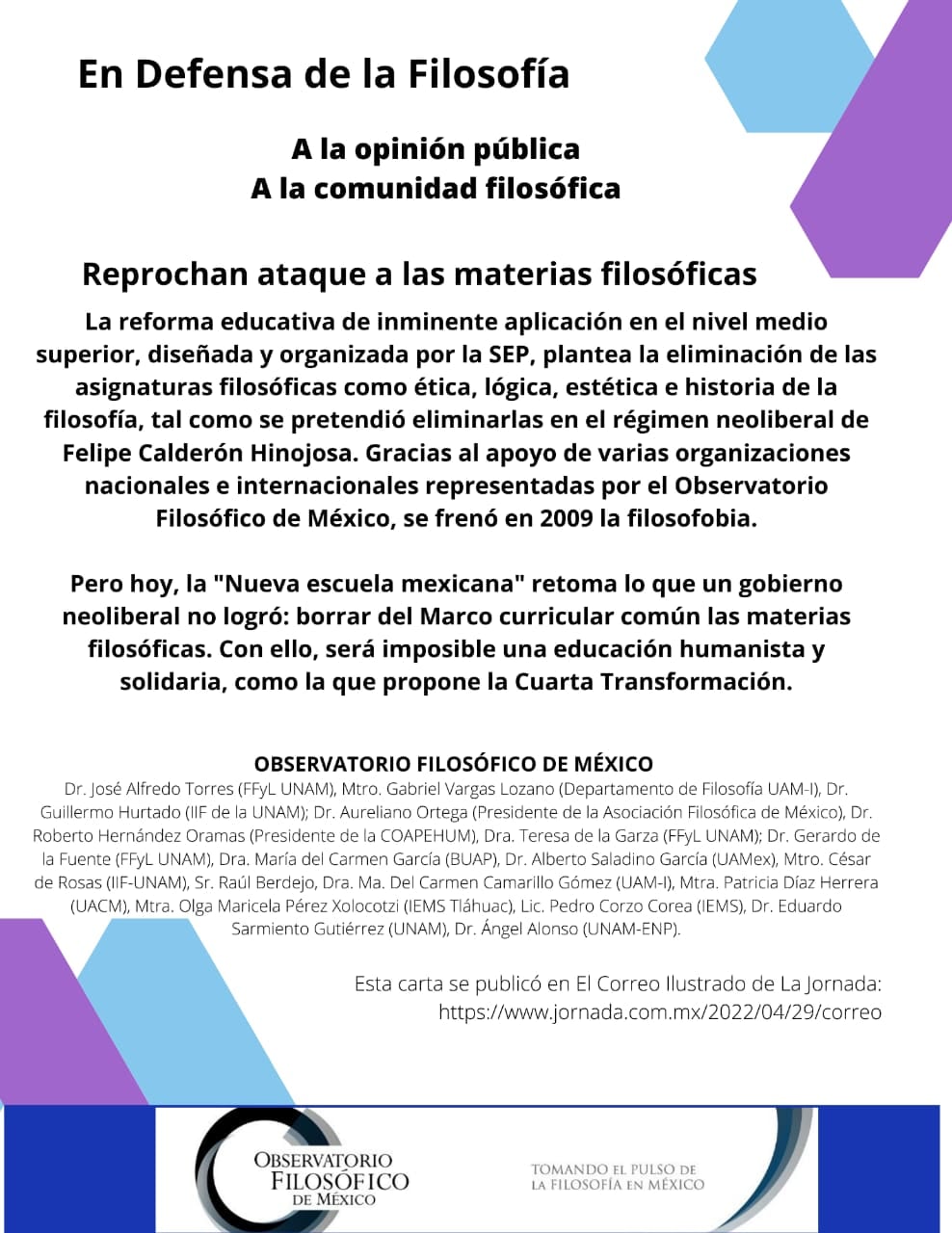 El Observatorio Filosófico de México lanzó publicó en El Correo Ilustrado del periódico La Jornada, una carta alertando de uno de los temas que más ha pasado desapercibido en el debate en torno a la reforma educativa que pretende llevar a cabo el actual gobierno, y que incluye, en el nivel medio superior, la eliminación de las asignaturas filosóficas: ética, estética, lógica e historia de la filosofía.