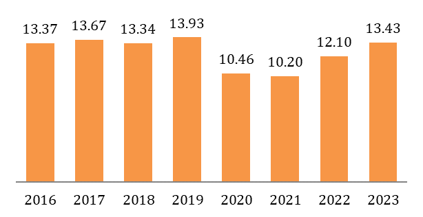 El SIDS incluye 11 indicadores en las diferentes categorías. De entre estos, hay al menos uno que merece ser destacado, porque sí se refiere a un resultado clave: la tasa defunción de menores de un año. Es de lo más relevante, porque esta mortalidad debería estarse reduciendo, pero se elevó ligeramente de 2016 a 2023 (ver gráfica). Como lo dice la ficha técnica del SIDS, “Las defunciones de menores de un año suelen estar asociadas con la falta de acceso a atención adecuada y prevención de padecimientos evitables y tratables; por lo que este indicador permite evaluar la eficacia del Sistema Nacional de Salud para asegurar el acceso a los servicios médicos de este grupo de población y sus madres, en las entidades federativas.[2]”