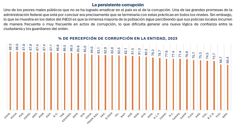 De acuerdo con la ENCIG, 2023, el 88.3% de las personas mayores de 18 años que viven en localidades de 100 mil habitantes o más perciben que la corrupción es frecuente o muy frecuente en sus entidades; las entidades con mejores valores son Querétaro con 68.4%; Yucatán, con 68.7%; Baja California Sur con 73.7%; Colima con 74.5% y Aguascalientes con 75.3%; en contraste, donde se registran peores calores son en Guerrero con 87.4%; Ciudad de México y Puebla, con 87.8% en cada una; Michoacán con 88% y Chiapas con 88.3%.