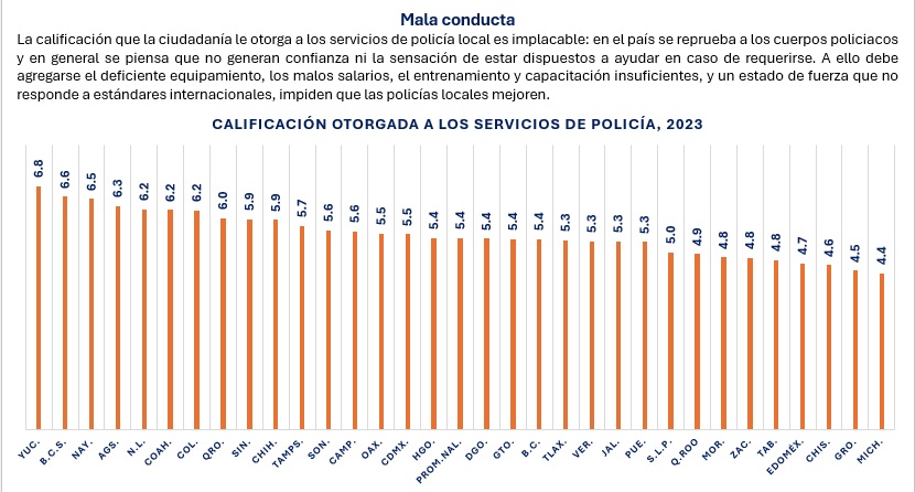 Los datos muestran que, en una escala de 1 a 10, los servicios de policía local se encuentran reprobados. En efecto, a nivel nacional, la ciudadanía otorga sólo una calificación de 5.4. Siendo las entidades con mejores puntajes Yucatán con 6.8; Baja California Sur con 6.6.; Nayarit con 6.5; Aguascalientes 6.3 y Nuevo León con 6.2.