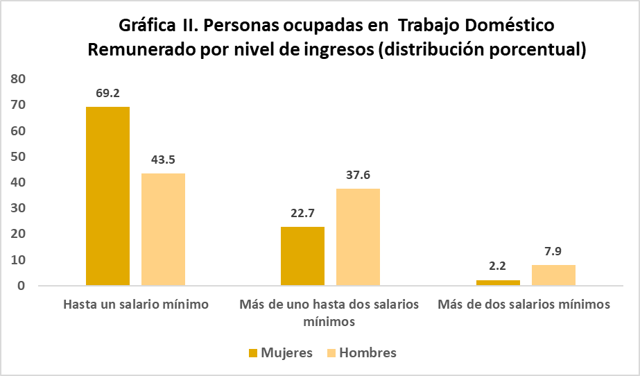 La clasificación de las personas ocupadas en TDR, por nivel de ingresos, hoy reporta que el 69.2% de mujeres sólo perciben hasta un salario mínimo, en contraste, con el 43.5% de los hombres que perciben hasta un salario mínimo.