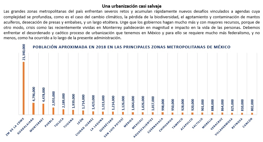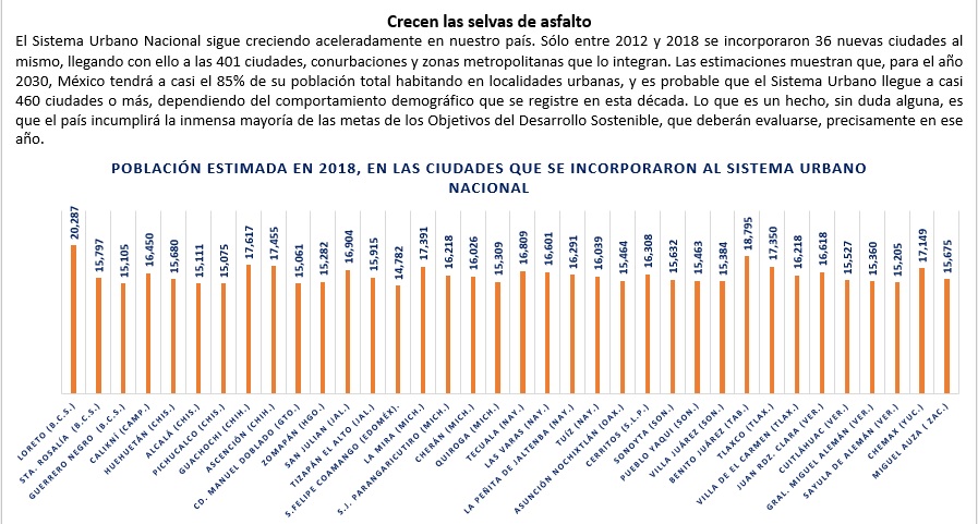 Así, de acuerdo con el COONAPO, en el año de 1878 México tenía sólo 51 ciudades con 15 mil habitantes o más. Para 1970 el número de ciudades de esa magnitud había llegado a 178; mientras que en el 2015 se llegó a una suma de 401 ciudades. Asimismo, para dimensionar el crecimiento del número de ciudades y su magnitud en el país, en 1970 había sólo tres ciudades con más de un millón de habitantes cada una de ellas; mientras que en el 2015 la suma fue de 15, es decir, hubo un crecimiento de cinco veces en la cantidad de ciudades, en sólo cuatro décadas.