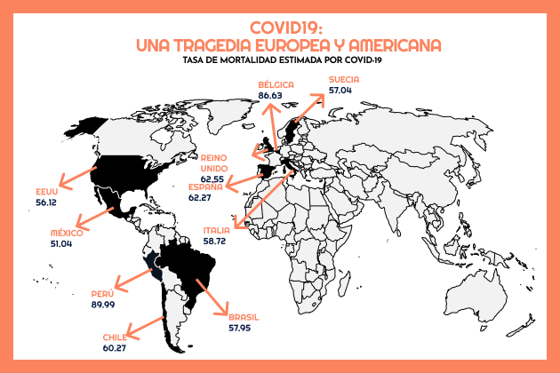 De acuerdo con los datos compilados por la Universidad Johns Hopkins, en su sitio electrónico especial sobre la pandemia de la COVID19, puede sostenerse que, hasta ahora, estamos ante una tragedia europea y americana, pues los países que registran las más altas tasas de mortalidad por la enfermedad causada por el virus del SARS-COV-2 se encuentran en estos dos continentes.